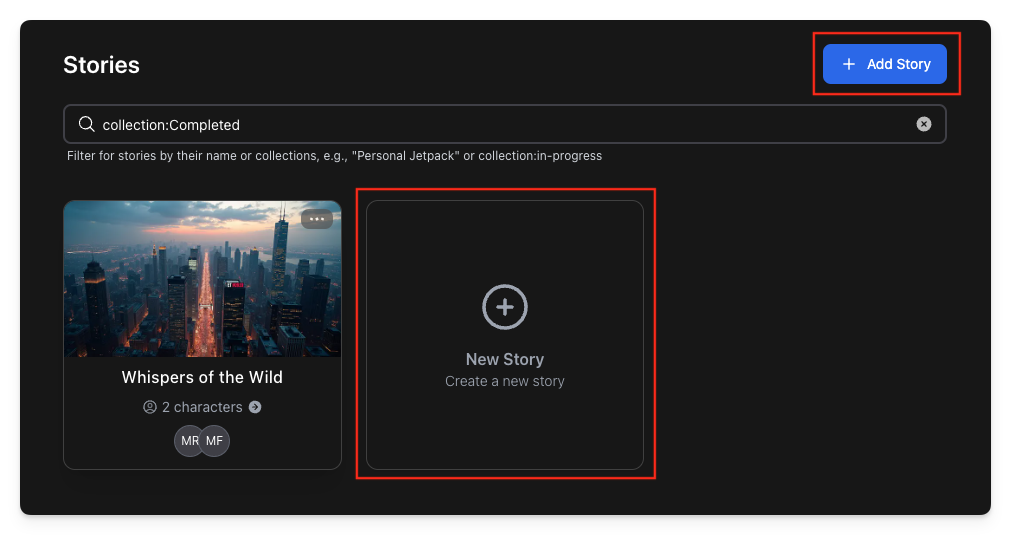To begin the process of creating a story, click on the "New Story" card on the Stories page: